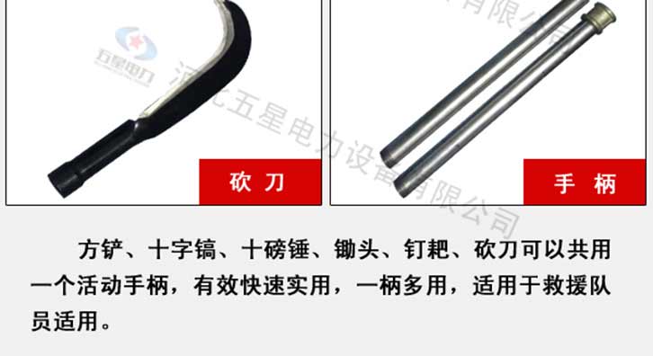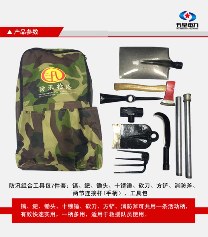 防汛組合工具包七件套:鎬、鈀、鋤頭、十磅錘、砍刀、方鏟、消防斧頭、活動柄、工具包。一柄多用,適用于救援隊員使用