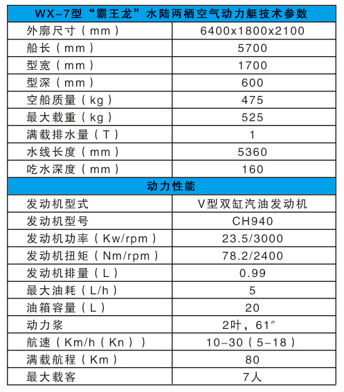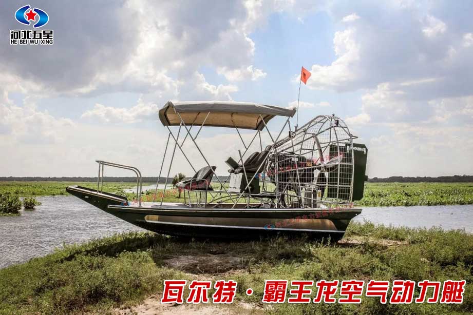 河北五星“霸王龍”水陸兩棲空氣動力艇是一種運用空氣動力學(xué)、采用航空發(fā)動機和空氣螺旋槳推動,通過置于船體上部的大功率內(nèi)燃機帶動碳纖維螺旋槳產(chǎn)生空氣動力的多地形交通工具。所搭載的航空發(fā)動機動力系統(tǒng)強勁,功率可達300馬力以上,螺旋槳推力可達500公斤以上,操縱機動靈活,靜水巡航速度可達40km/h,可以高時速可達70km--120km/h。